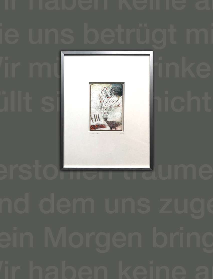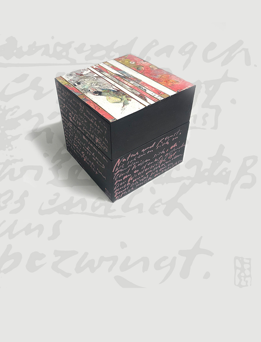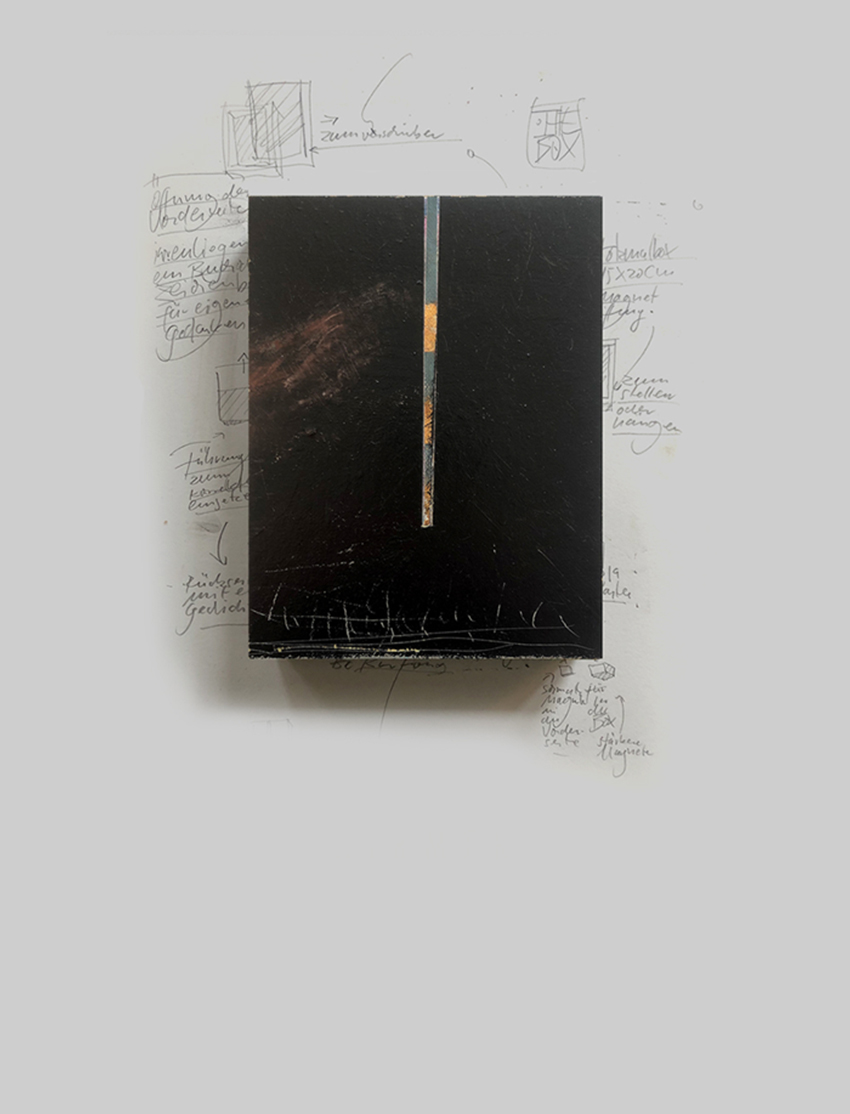 Zwei lose zusammengesetzte Holzmalkästen im Format 6x15 cm und 9x15 cm. Die Unterseite hat zwei Führungsschienen oder Magnete, wodurch die Oberseite leicht abzunehmen und wieder Aufzusetzen ist. Das obere Bild ist Ölfarbe auf Holzmalfläche gemalt und verleimt. Das Gedicht oder der Text ist um alle vier Seiten mit Pinsel oder Edding geschrieben.
