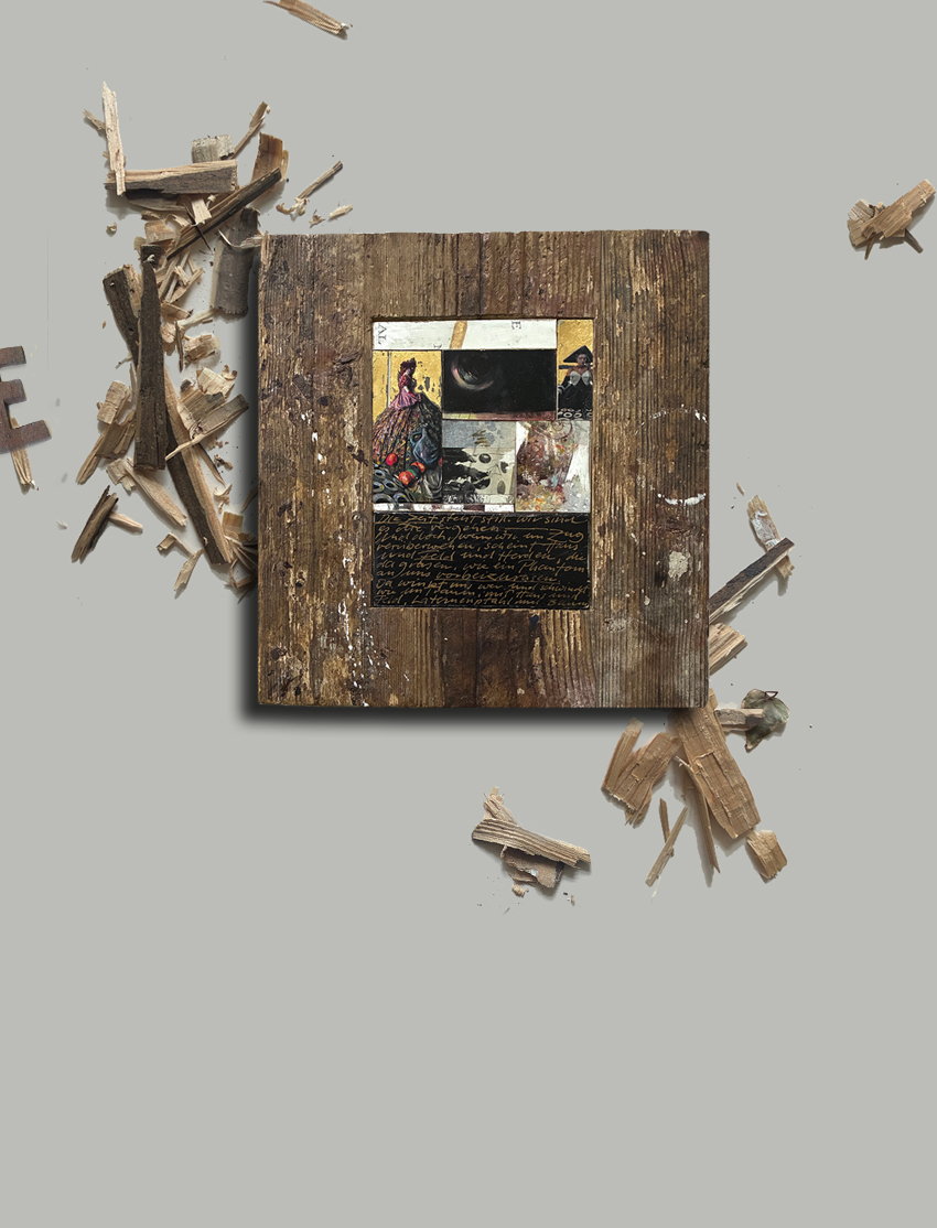 Raum und Zeit / Mit dem Gedicht ( Die Zeit steht still ) von M. Kaléko. Ölfarbe, Blattgold auf Holzmalflächen, eingepasst und verleimt im Holzblock 32x38 cm , Tiefe 5 cm. 2025