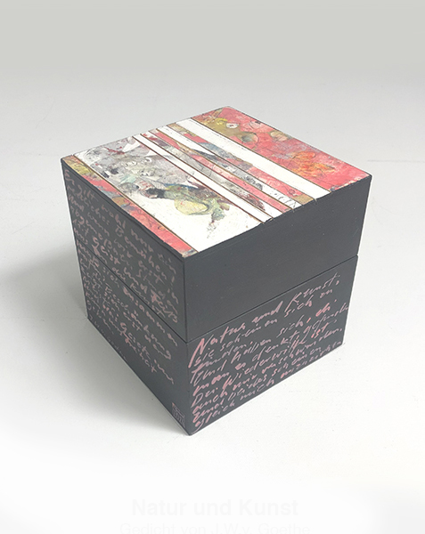 Ölfarbe auf Holzmalbox 15x20 cm, Tiefe 3 cm. Mit Magnetöffnung der Vorderseite. Innenliegend ein Notizbuch für Ihre Gedanken und Eindrücke, die Ihnen begegnen.