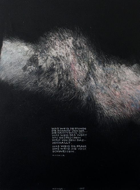 Ein Moment der Stille und des Innehaltens, so empfinde ich den Prozess beim Malen. Da entsteht wie von selbt eine Gestalt, ein Gefieder, ein Haus eine Farbstimmung, es gilt der Intuition zu folgen. Malen bedeutet auch, sich fallen zu lassen, aus sich selbst zu schöpfen. Eine Spur wird gefunden und dabei neue gelegt, die wiederum nicht alle gegangen werden, so ist das Bild letztlich eine Reduzierung auf das Wesentliche in sich selbst.
