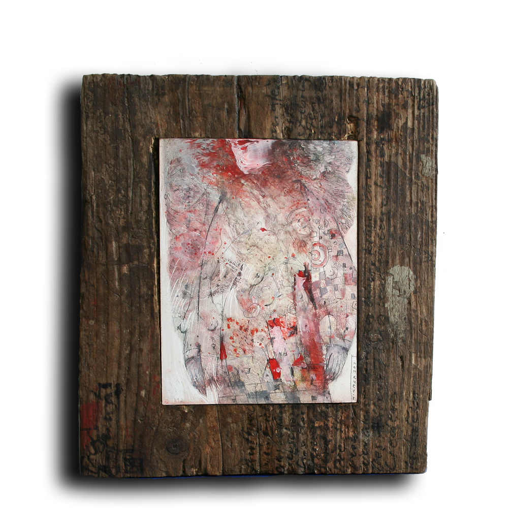 Eingebettet sind Bilder von bemalten Holzmalflächen, zusammengesetzt und eingepasst in ein altes Stück massiven Holzbohle aus Berlin. Die Kombination mit der Leichtigkeit, Zartheit und auch Verspieltheit der Bilder mit der Schwere des Holzblocks empfinde ich als Künstler sehr reizvoll.