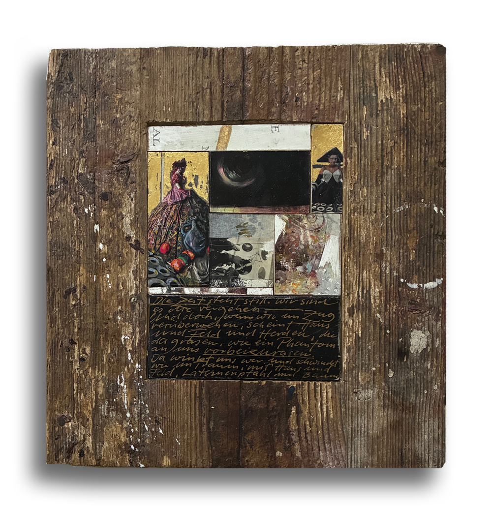 Mit dem Gedicht ( Die Zeit steht still ) von M. Kaléko. Ölfarbe, Blattgold auf Holzmalflächen, eingepasst und verleimt im Holzblock 32x38 cm , Tiefe 5 cm. 2025