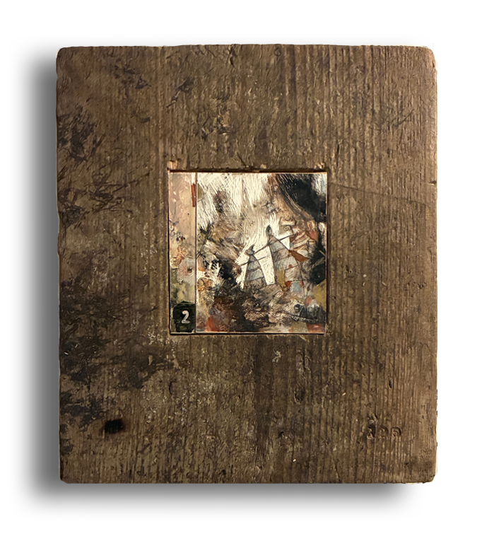 Ölfarbe auf Holzmalfläche 11x16 cm, eingepasst und verleimt im Holzblock 21x29,5 cm, Tiefe 5 cm. | 2025