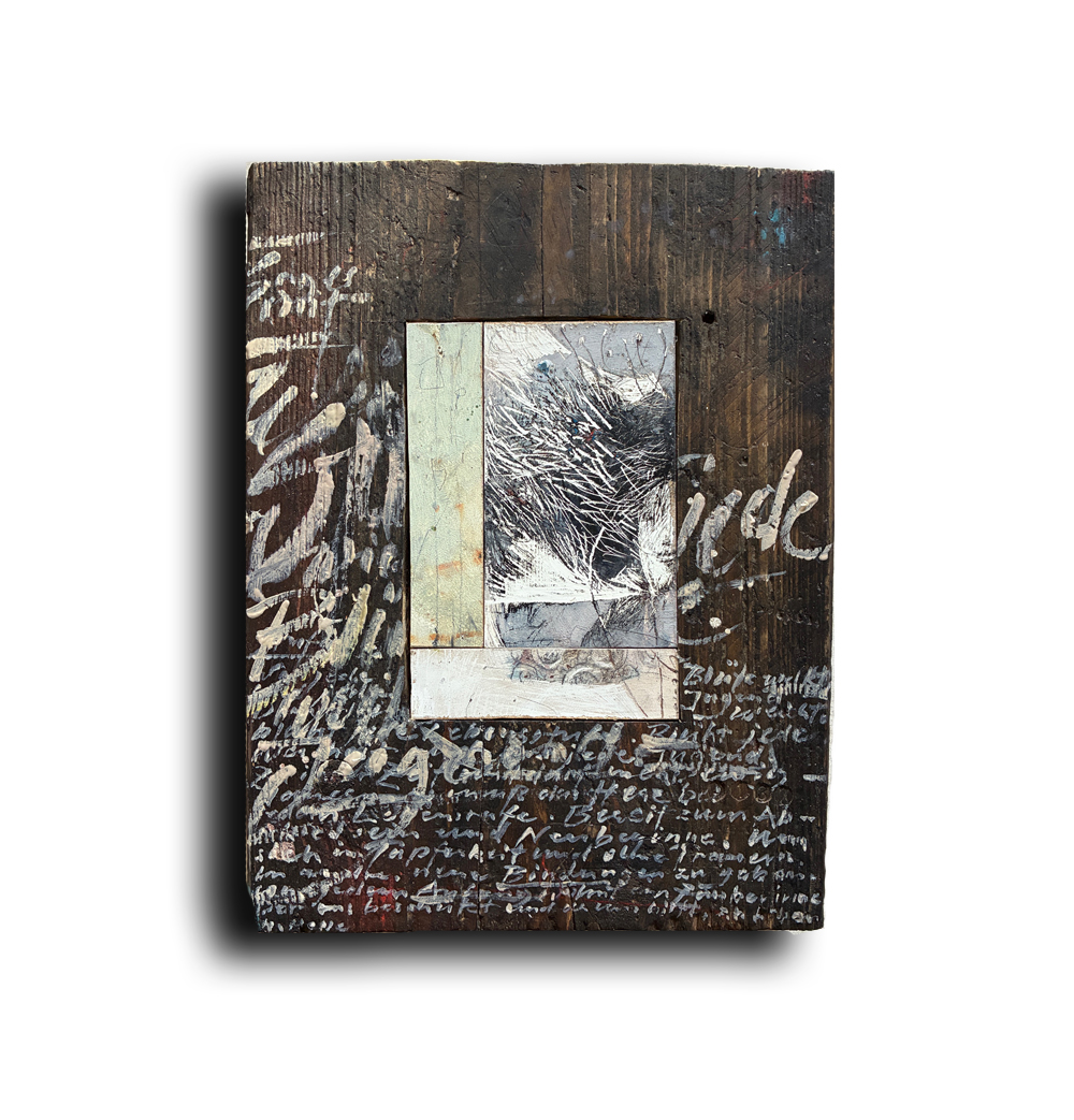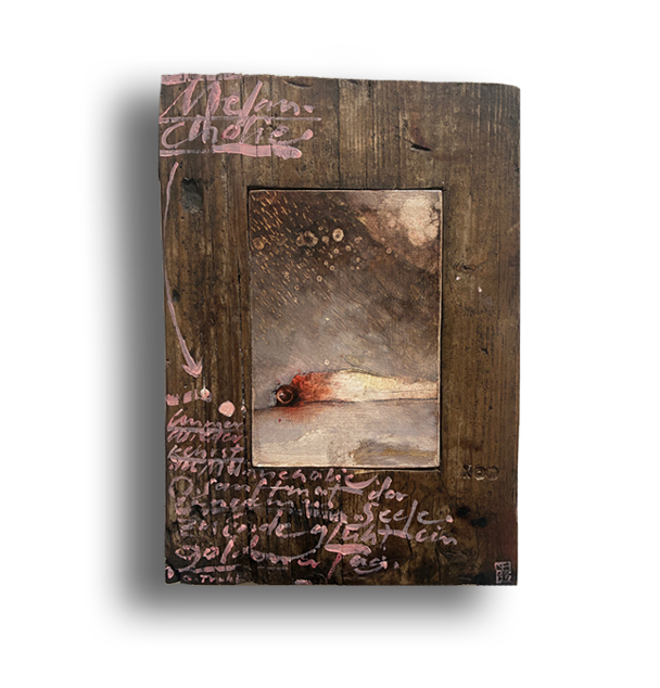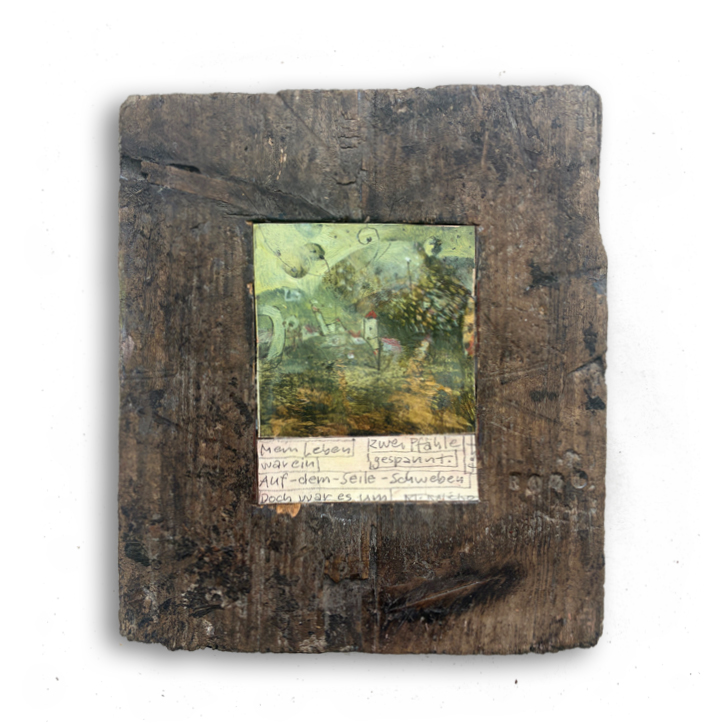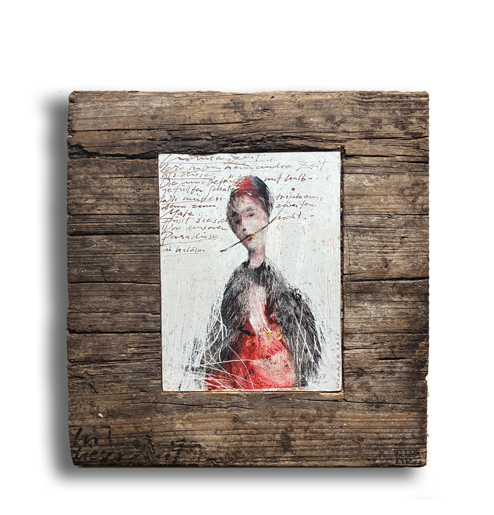 Mit einem Gedicht von M. Kaléko. Ölfarbe auf Holzmalfläche, eingepasst und im Holzblock 27x30,5 cm verleimt, Tiefe 5 cm. | 2025