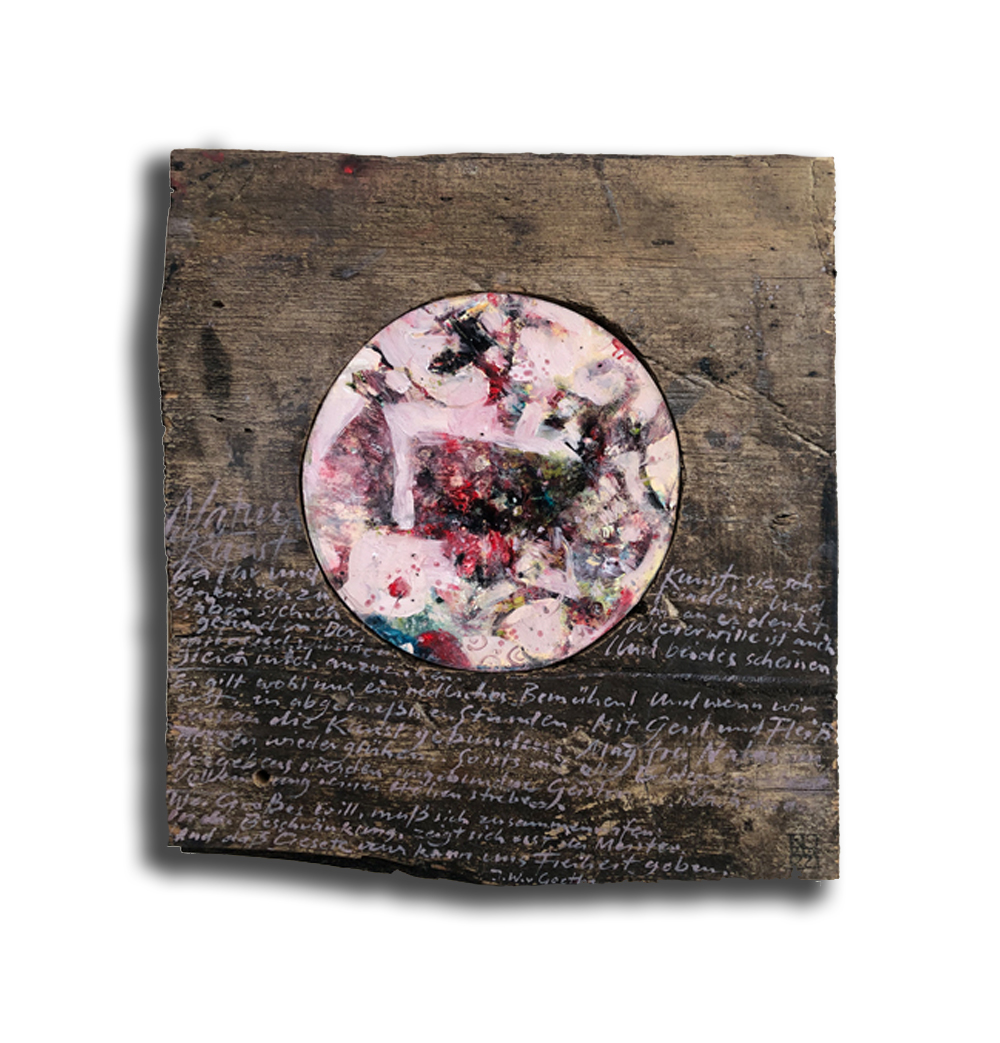 Mit einem Gedicht von J.W. Goethe. Ölfarbe auf Holzmalfläche, eingepasst und im Holzblock 29x32 cm verleimt, Tiefe 5 cm. | Eine Arbeit von 2022