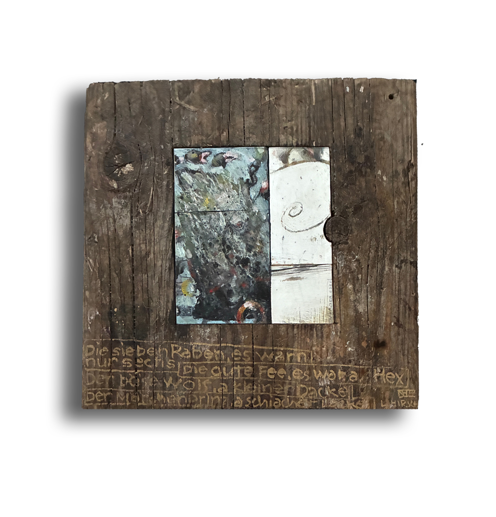 Mit einem Gedicht von M. Kaléko. Ölfarbe auf Holzmalfläche, eingepasst und im Holzblock 31x30 cm verleimt, Tiefe 5 cm. | 2025