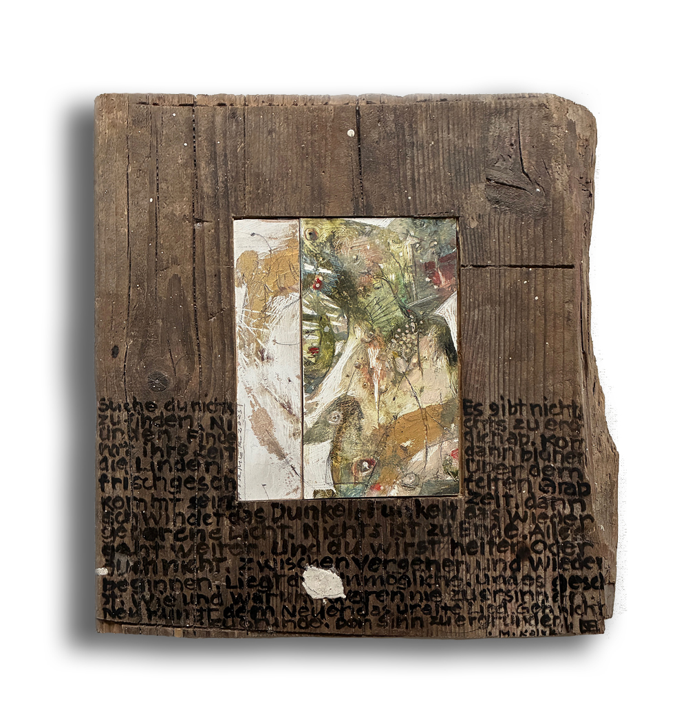 Mit dem Gedicht von M. Kaléko. Ölfarbe auf Holzmalfläche, eingepasst und verleimt im Holzblock 30 x 31 cm, Tiefe 5 cm. | 2025