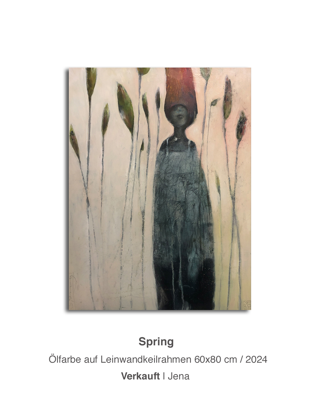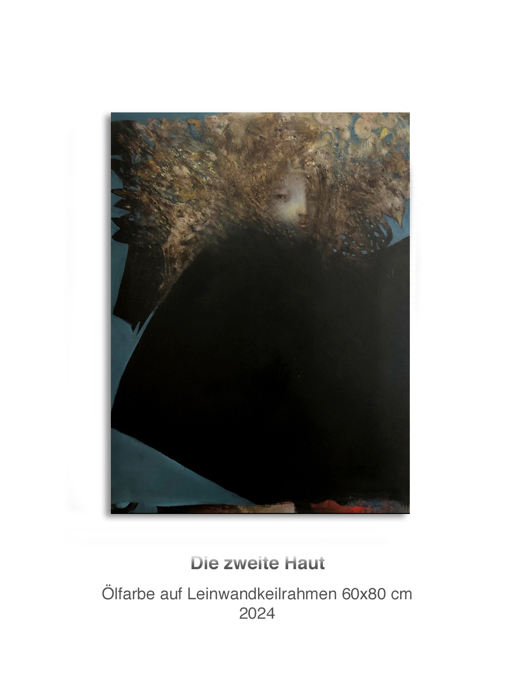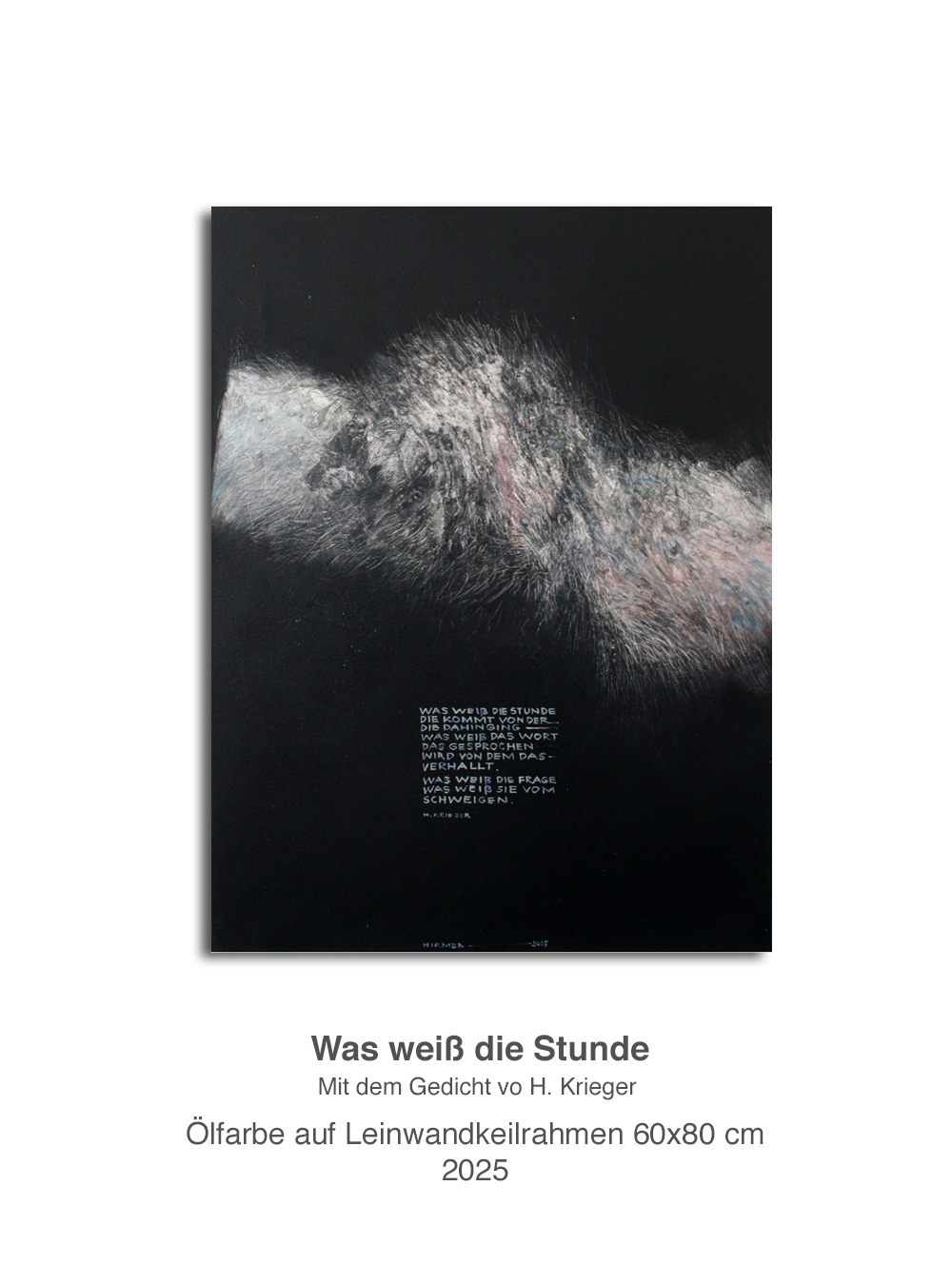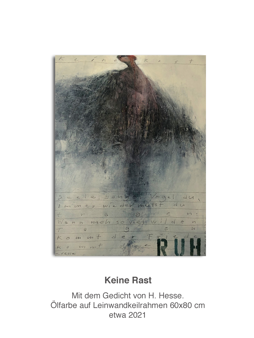 Ein Moment der Stille und des Innehaltens, so empfinde ich den Prozess beim Malen. Da entsteht wie von selbt eine Gestalt, ein Gefieder, ein Haus eine Farbstimmung, es gilt der Intuition zu folgen. Malen bedeutet auch, sich fallen zu lassen, aus sich selbst zu schöpfen. Eine Spur wird gefunden und dabei neue gelegt, die wiederum nicht alle gegangen werden, so ist das Bild letztlich eine Reduzierung auf das Wesentliche in sich selbst.