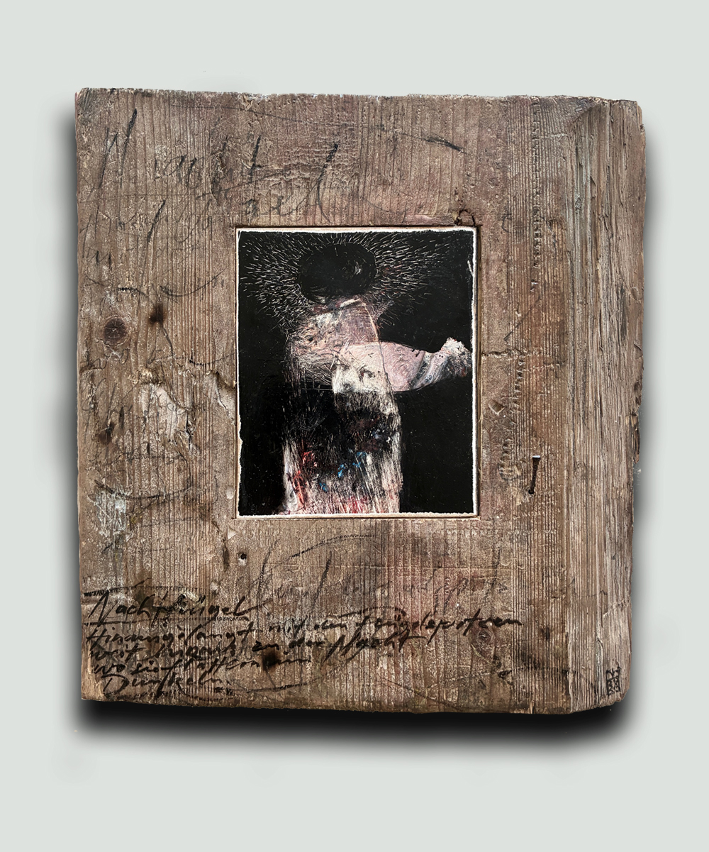 Nachtflügel / Ölfarbe auf Holzmalfläche, eingepasst im Holzblock 31x33 cm | 2026